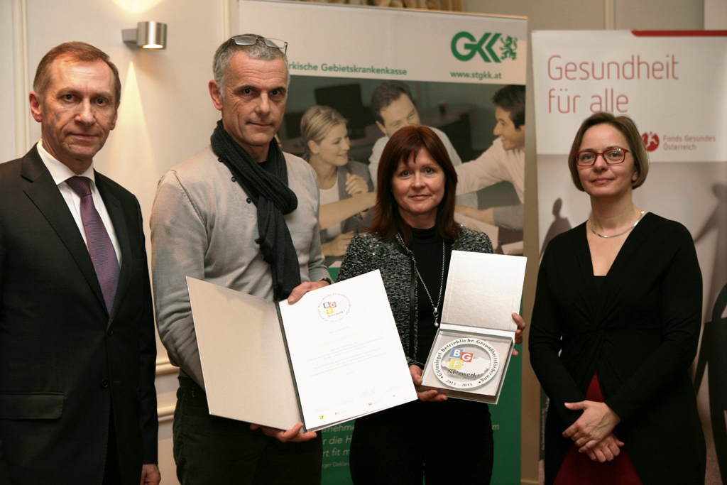 am 14. märz 2013 erhielt planconsort im Rahmen einer feierlichen zeremonie im hotel weitzer in graz das gütesiegel für betriebliche gesundheitsförderung verliehen. von den 19 ausgezeichneten firmen steiermarkweit ist planconsort unter jenen drei, die das gütesiegel nach 2007 und 2010 bereits zum dritten mal erhalten. ein schöner beweis für die nachhaltigkeit und qualität unseres bgf-projektes, mit dem wir die vergabekommission wieder überzeugen konnten. sigrid legat als bgf-verantwortliche und percy kortschak für die geschäftsführung nahmen die auszeichnung entgegen und konnten die grundzüge unseres projektes – sozialer zusammenhalt – bewegungsmaßnahmen – wohlfühl-maßnahmen – auch dem versammelten publikum präsentieren.