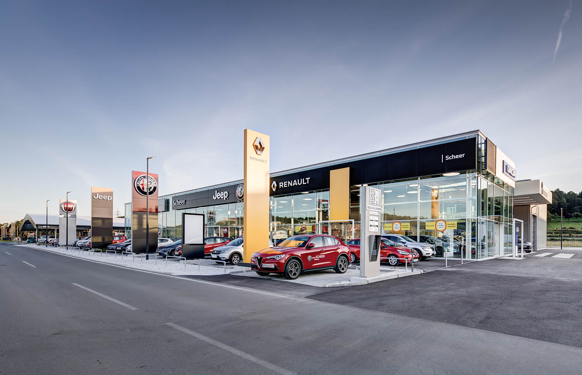 auf dem runf 7.500 m2 großen areal entstanden in nur 10 monaten bauzeit eine ausstellungshalle für neu- und gebrauchtwagen, werkstätte inklusive prüfstraße und ein reifenlager.