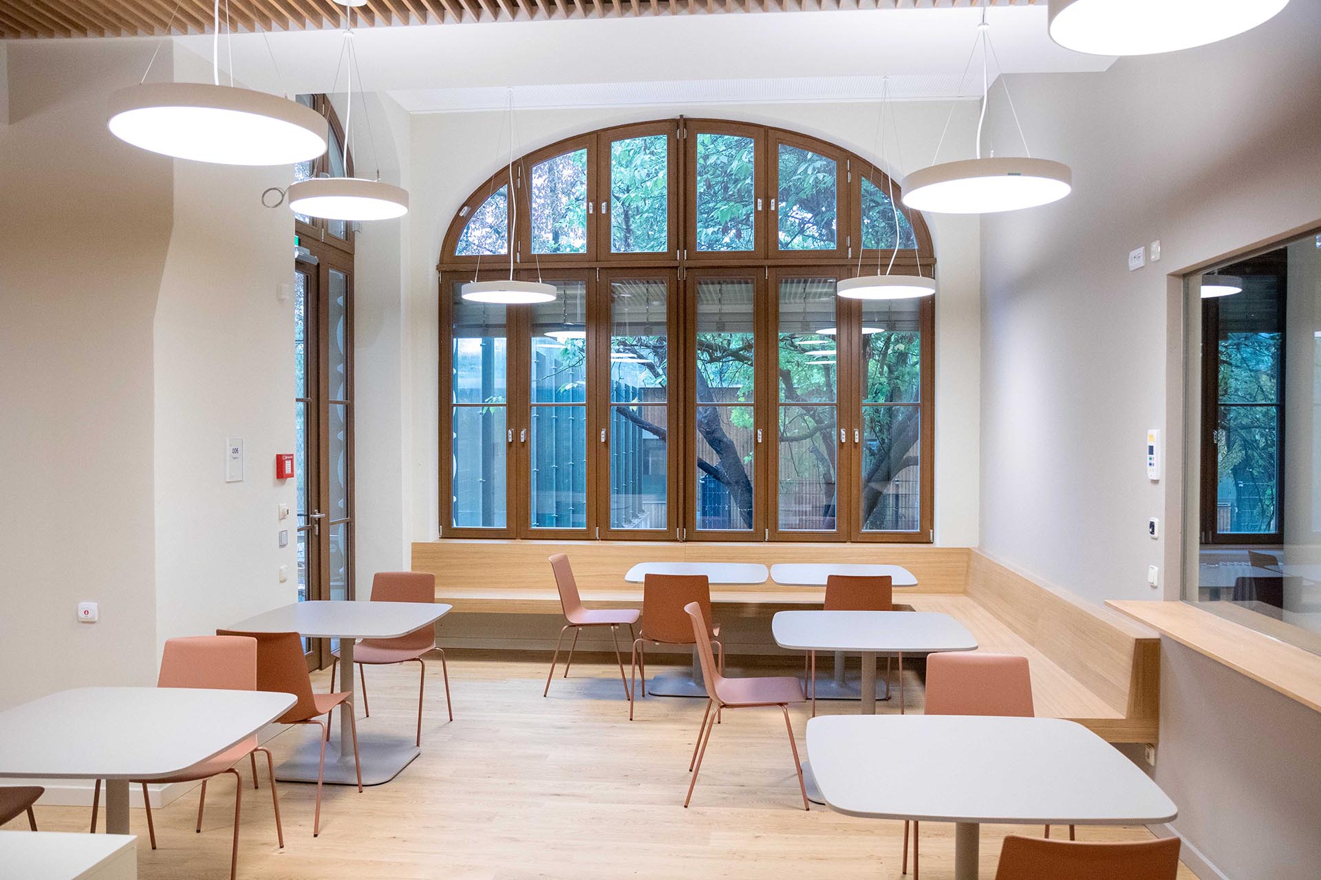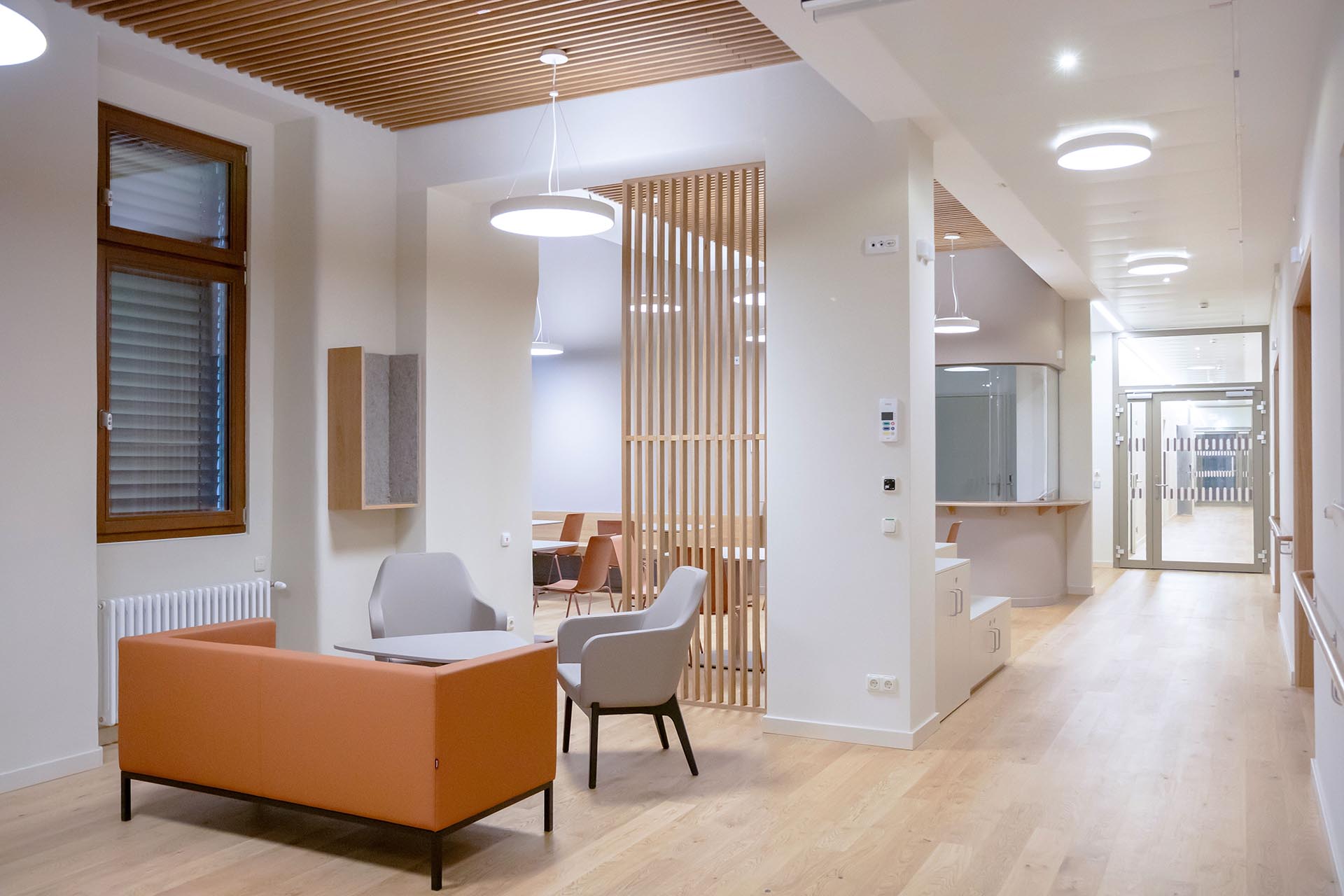 insgesamt wurden 14 neue 2-bett-zimmer mit jeweils eigenem bad sowie funktions-, therapie- und personalräume errichtet. die historische außenfassade blieb weitgehend unverändert. aus energietechnischen gründen wurden allerdings die fenster erneuert und am dach pv-paneele installiert. die zugangstreppe in den garten und die außenanlage erfuhren ebenfalls eine neugestaltung. das gesamte investitionsvolumen betrug rund € 10 mio.