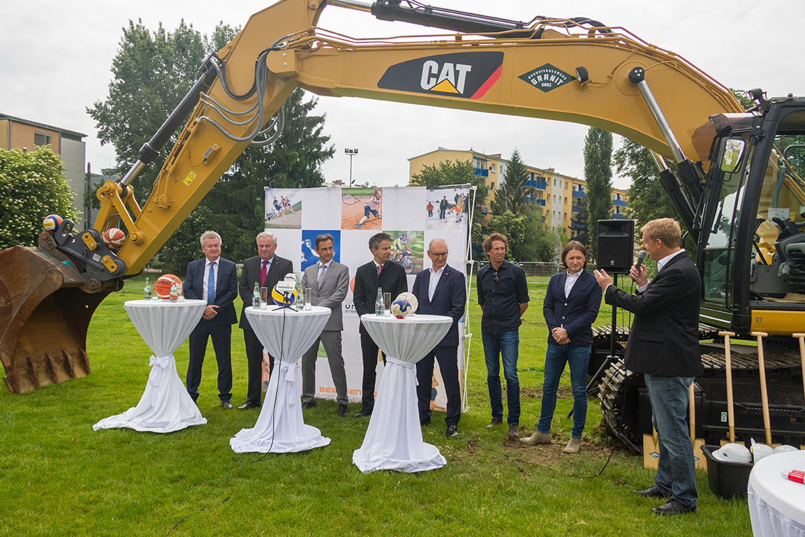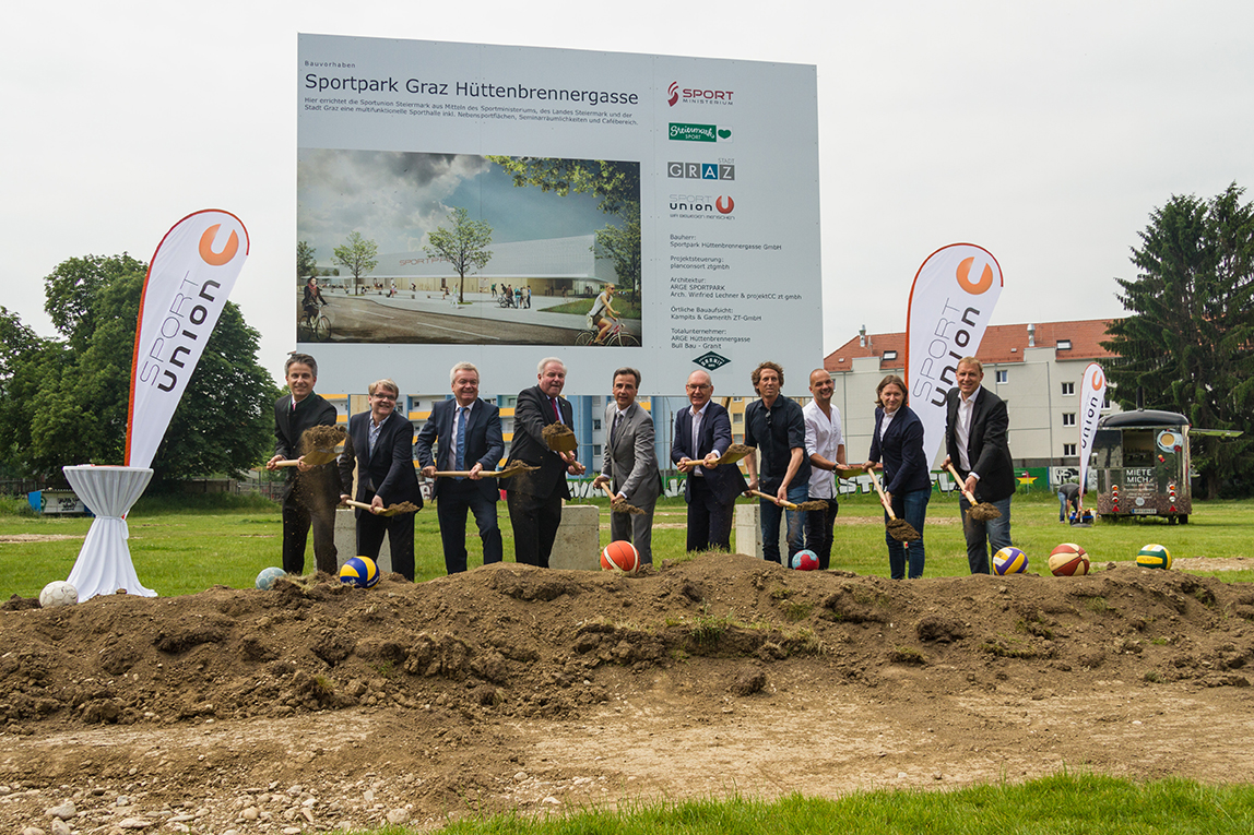 nach erfolgreichem abschluss des vergabeverfahrens anfang mai wurde am 01.06.2017 der spatenstich feierlich begangen. in anwesenheit von landeshauptmann hermann schützenhöfer, sportlandesrat anton lang, bürgermeister siegfried nagl, sportstadtrat kurt hohensinner und sportunion-präsident stefan herker starteten somit die bauarbeiten für das leitprojekt einer modernen multifunktionshalle für die sportarten basketball, handball und volleyball.