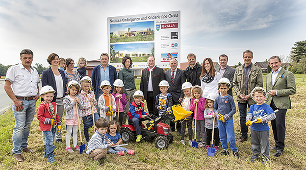 am 19.05.2016 erfolgte unter anwesenheit der begeisterten zukünftigen benutzer der spatenstich zum neuen kinderbetreuungszentrum gralla. das von der marktgemeinde gralla errichtete und von der planconsort ztgmbh in abstimmung mit der zuständigen kindergartenbehörde des landes geplante kinderbetreuungszentrum besteht aus einem zweigruppigen kindergarten und einer eingruppigen kinderkrippe.