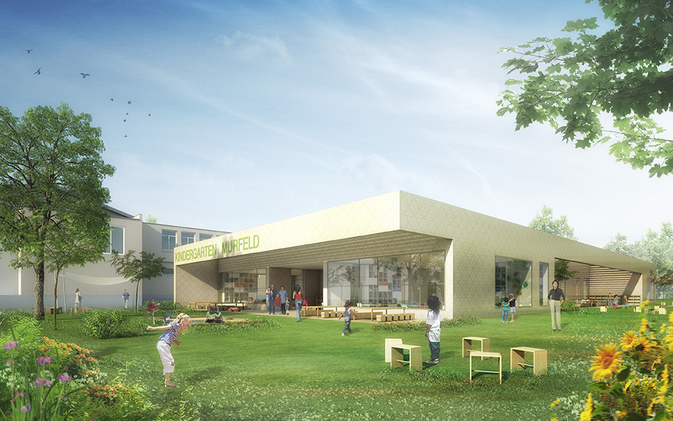 aufgabenstellung war die planung eines 2-gruppigen kindergartens mit angeschlossener kindergrippe im bereich der volksschule murfeld. im rahmen eines gestalterischen gesamtkonzeptes wurde ein kompakter und wirtschaftlich zu errichtender baukörper gewählt. die äußerer erschließung dient als gemeinsame begegnungszone mit der volksschule, die innere erschließung strukturiert das raumprogramm entsprechend den nutzungseinheiten. die planung besticht vor allem durch eine klare und funktionelle gliederung der funktionen und eine zeitgemäße architektonische formensprache.